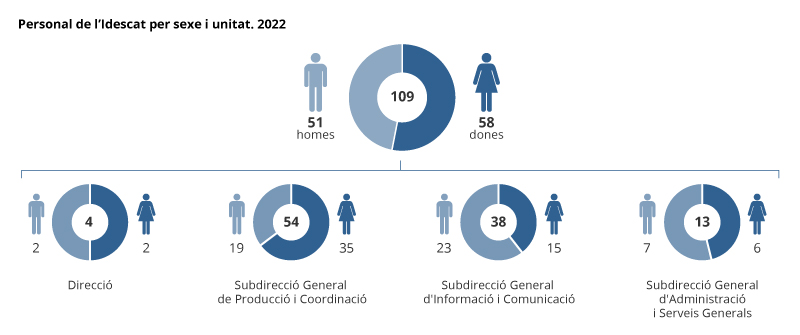 La plantilla del Idescat a 31 de diciembre de 2022 estaba integrada por 109 personas, de las cuales 58 eran mujeres y 51 eran hombres.