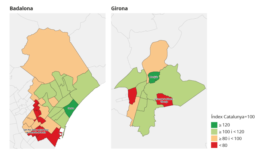 The IST for Girona was 98.4, very close to the average for Catalonia (IST=100), but in the Girona 7 (Montjuïc) census tract group the IST was 127.8 while in Girona 2 (La Font de la Pólvora - Vila-roja) it was 51.4. There was therefore a difference of 76.4 points between these two census tract groups in the same municipality.